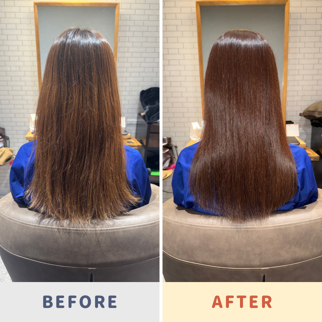 お客様一人ひとりに合わせて配合した天然の栄養素を浸透させ、髪の内側から綺麗に整えることで、色落ちしにくい髪の毛を育てていきます。