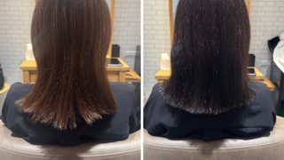 こちらのお客様はセルフカラーを繰り返していたことで色斑が出てしまい、さらに強い薬剤で染め続けていたために必要以上に明るくなってしまっている状態でした。