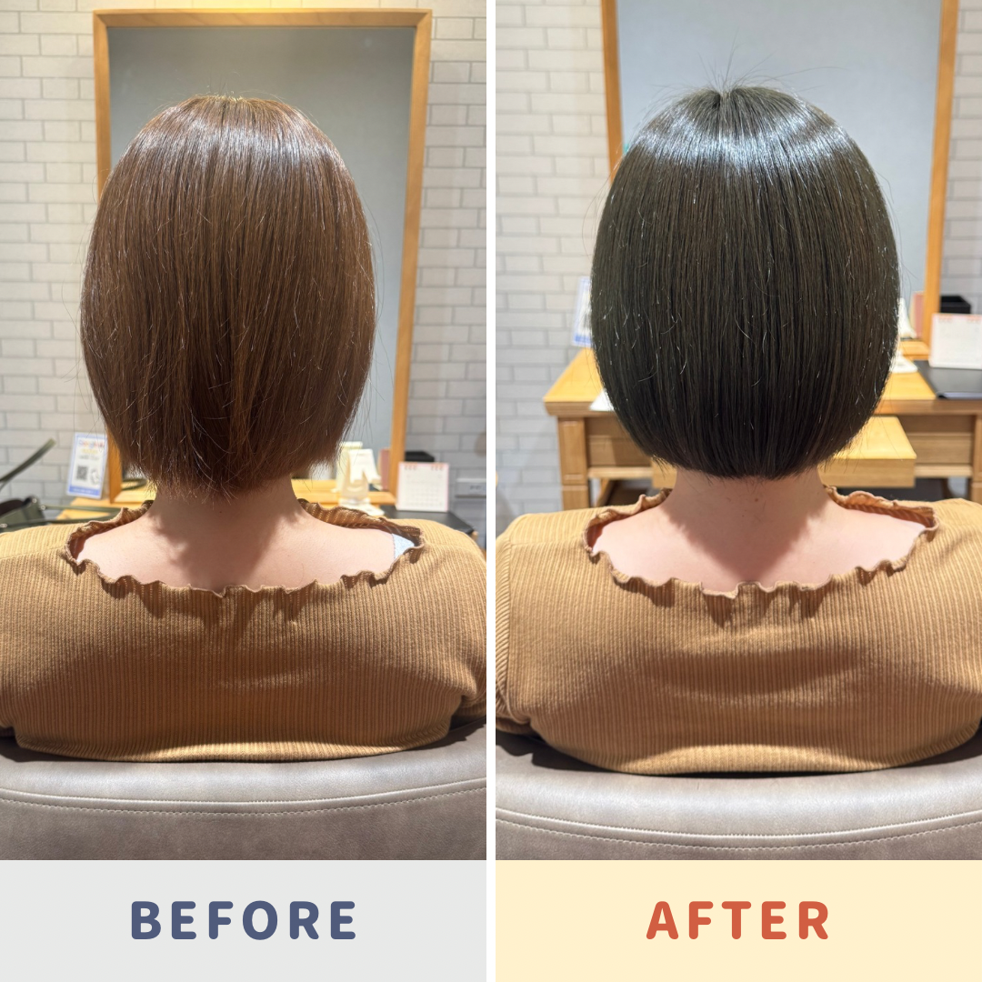黄ばみが抑えられ、ツヤと柔らかさのある自然なボブスタイルに。