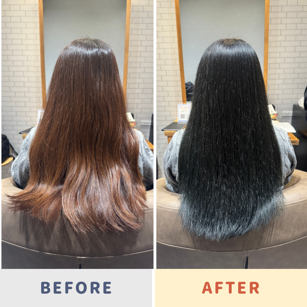 写真のように色味が落ち着き、潤いのあるまとまりやすい髪へと仕上がりました。