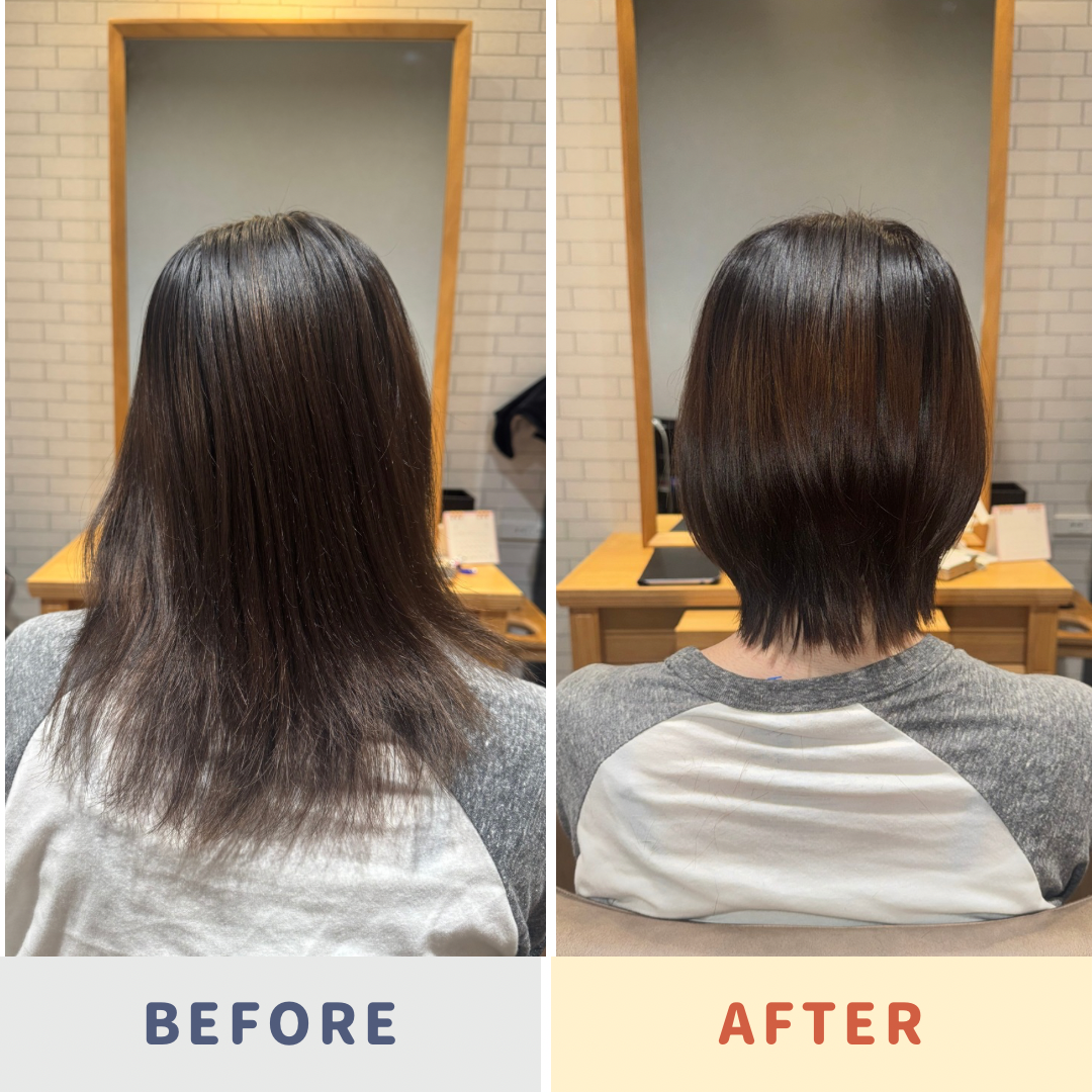 毛先のばらつきを整え、自然に内巻きになりやすいようにカットすることで、まとまりやすくツヤのあるボブスタイルに仕上げました。