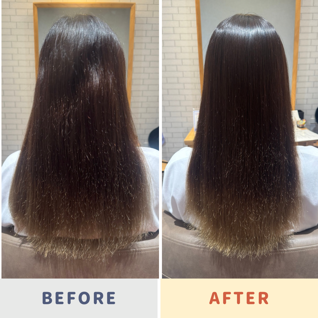 毛先にブリーチが入っており、全体的に広がりやすくなっている状態でした。