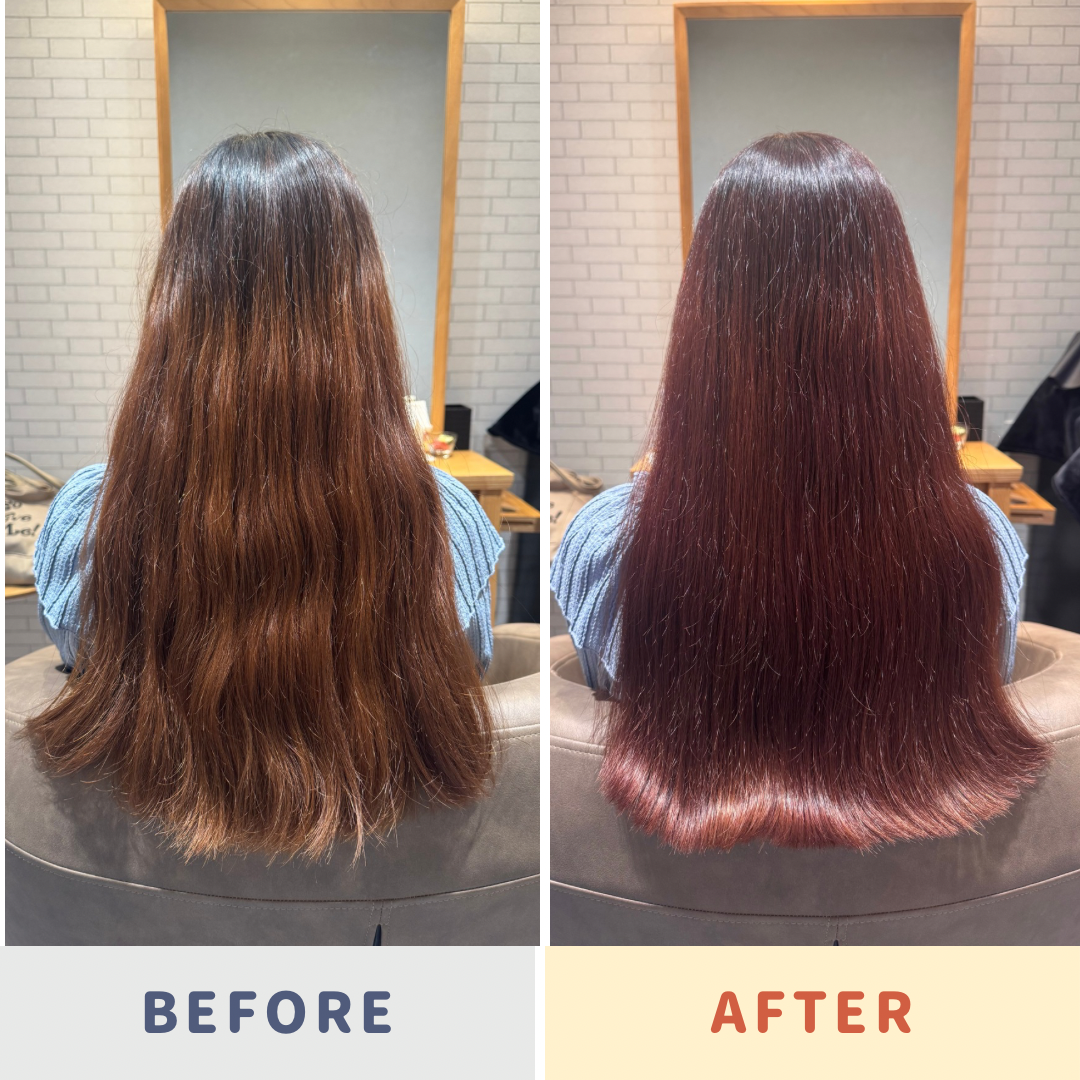 光に当たると赤みがしっかりと感じられるツヤ髪に。